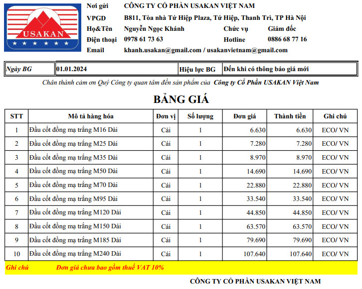 | 10 | Đầu cốt đồng mạ trắng M240 Dài | Cái | 1 | 107.640 | 107.640 | ECO/ VN | |||