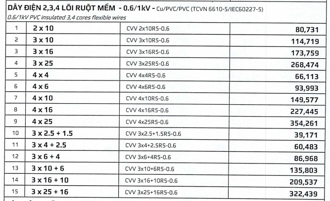 người- Dây điện 2,3,4 lõi ruột mềm - 0.6/1kV - Cu/PVC/PVC - Goldcup