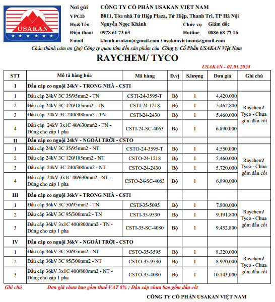 | 1 | Đầu cáp 24kV 3C 35/95mm2 - TN | CSTI-24-3595-T | Bộ | 1 | 4.420.000 | Raychem/ Tyco - Chưa gồm đầu cốt | |||