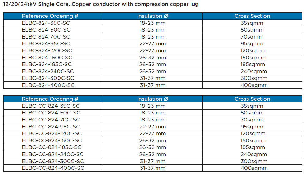 | 3 | Đầu cáp T-Plug 24kV 3x1Cx150/240mm2 800A (Dùng cho cáp đơn pha) | ELBC-824-1524-SC | Bộ | 1 | 8.580.000 | Ins: 26-32mm | |||