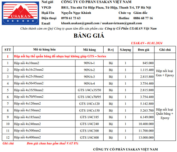 | 2 | Hộp nối 4x16-25mm2 | 90NA-2 | Bộ | 1 | 1.115.400 | ||||