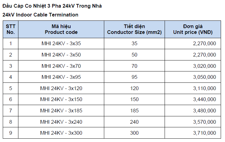 | 8 | 24kV 3Cx300mm2 | MHI-24-3x300 | Bộ | 1 | 6.570.000 | ||||