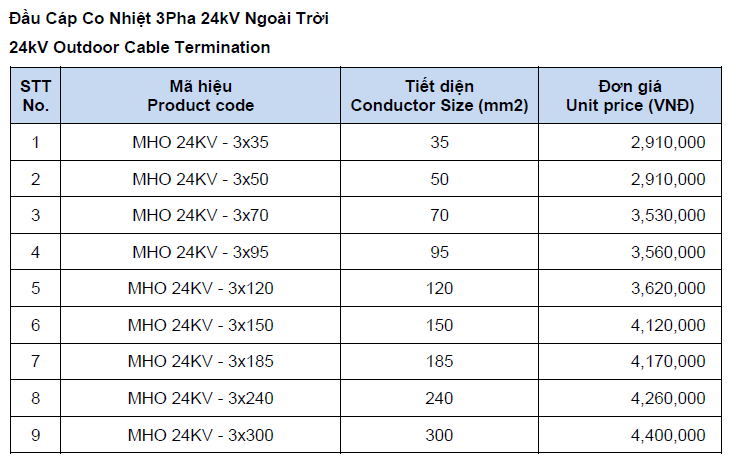 | 2 | 24kV 3Cx70mm2 | MHO-24-3x70 | Bộ | 1 | 4.080.000 | ||||