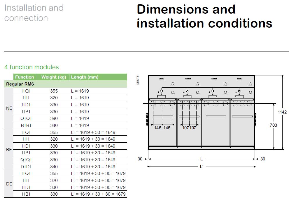 Tủ RMU 24kV 20kA/1s loại 4 ngăn, không mở rộng, cách điện khí SF6. Gồm 3 ngăn CDPT 630A cho cáp đến/ đi + 01 ngăn CDPT 200A có đế lắp chì bảo vệ MBA. RM6-Ne-IIQI (20kA/1s) - Chưa gồm cầu chì